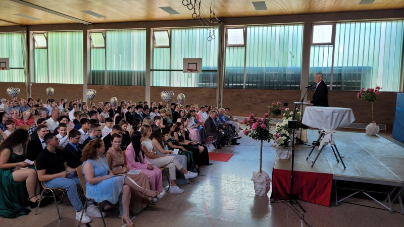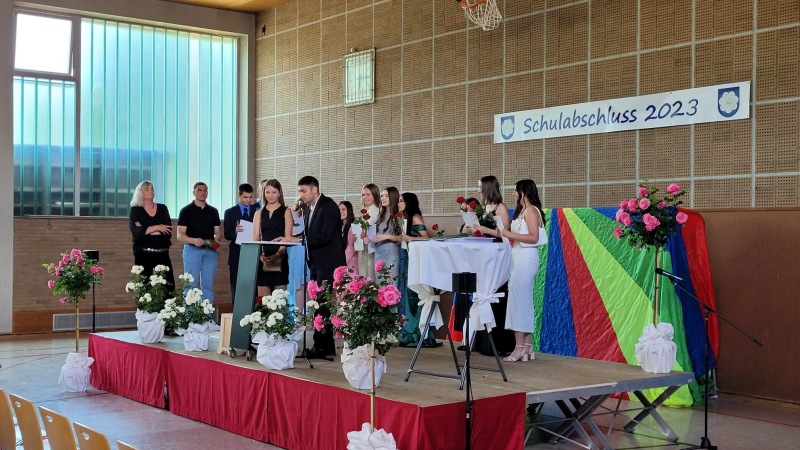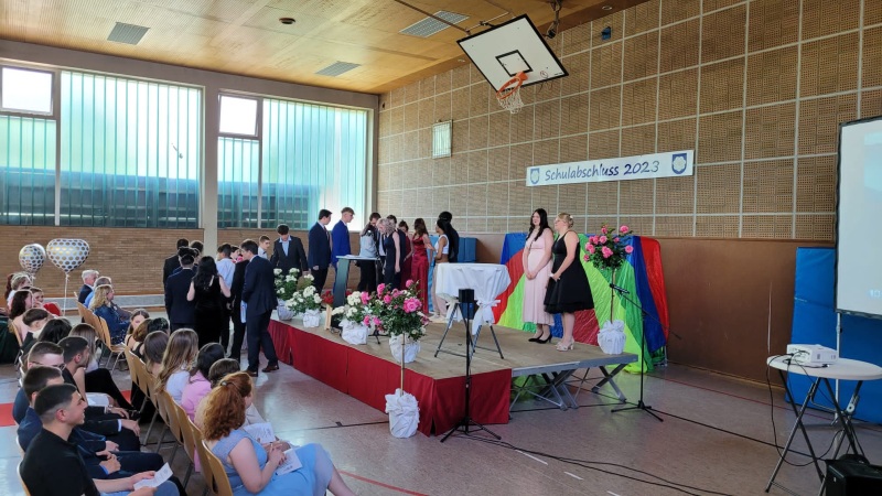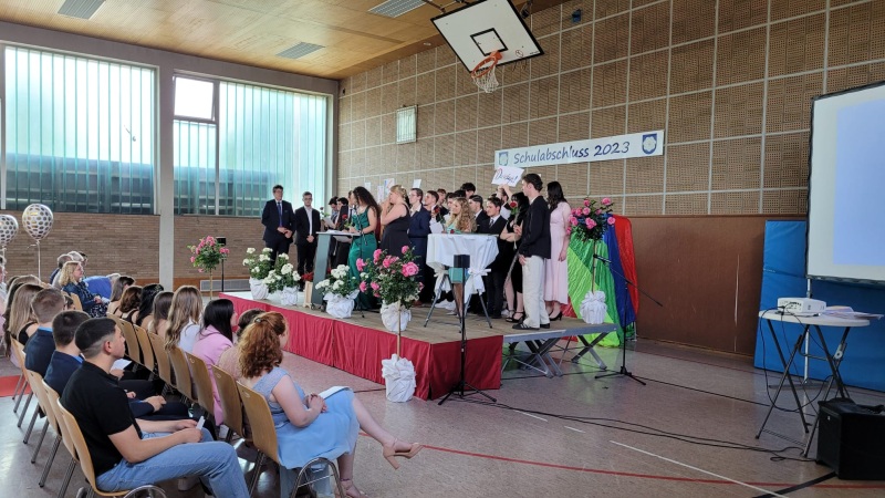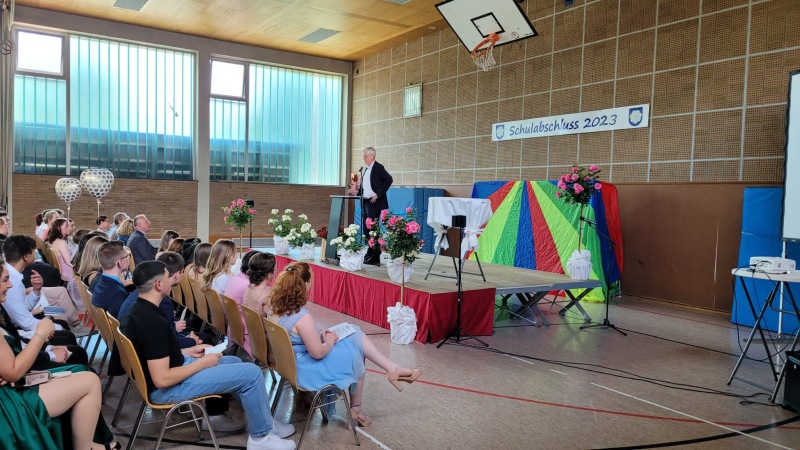 Am Freitag, den 23. Juni 2023, konnten wir 43 unserer Schülerinnen und Schüler der Jahrgänge 9 und 10 entlassen. Bei strahlendem Sonnenschein aber auch sehr heißen Temperaturen in der Sporthalle, nahmen die Absolventinnen und Absolventen ihre Zeugnisse entgegen. Glückwünsche erhielten sie dabei vom Bürgermeister, Herrn Pahlmann, und den drei Vertretern der Religionsgemeinschaften, der muslimischen, katholischen und evangelischen Gemeinden in Bramsche.