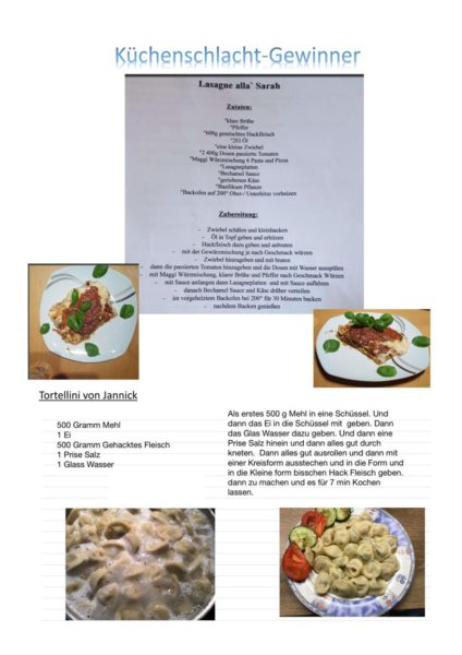 Zwei Schüler haben allerdings ihrem Gericht den letzten Schliff geben können und somit die Konkurrenz (k)alt aussehen zu lassen: Sarah hat eine Lasagne gekocht, bei der einem schon beim Anschauen das Wasser im Mund zusammenläuft. Jannick konnte mit selbstgemachten Tortellini überzeugen, die sicher viel Arbeit gemacht haben.