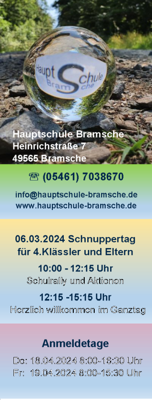 Die Hauptschule Bramsche war durch ihre Schulleiterin Frau Hierse vertreten. Wir freuen uns als Schulgemeinschaft diese Wochen als Startschuss für eine intensive Auseinandersetzung mit dem Thema „Schule ohne Rassismus-Schule mit Courage“ zu nutzen. Weitere Aktionen der Schulgemeinschaft werden im Anschluss folgen.