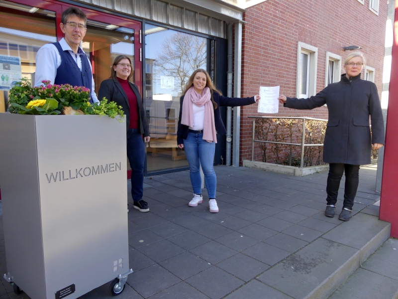 Am 23.02.2022 erhielt die Hauptschule Bramsche im Rahmen einer kleinen Zeremonie das Gütesiegel „Startklar für den Beruf“ überreicht. Frau Mareike Himmelreich, Jurorin der Aktionsgemeinschaft Gütesiegel Weser-Ems kam in die Schule und übergab der Konrektorin Frau Claudia Eggemann und den für die Berufsorientierung verantwortlichen Lehrkräften Klaudia Stolecki und Stefan Rudys die offizielle Urkunde.